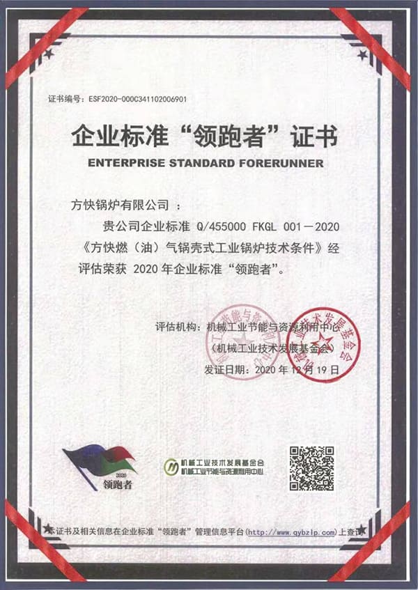 2020 年,方快的“燃(油)气锅壳式工业锅炉技术条件”获得了企业标准“领跑者”大会的高度认可,成为行业唯一。