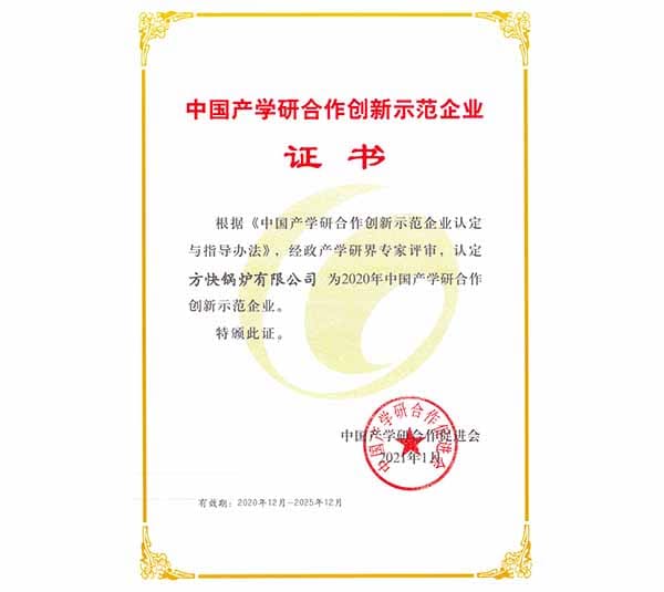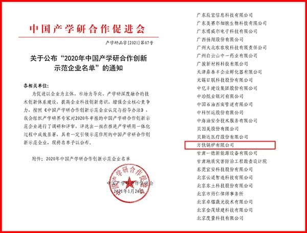 近日,方快锅炉凭借着长期在产学研领域的合作投入,以及在促进科技成果转化,自主创新工作层面的突出成绩,成功入选了“ 2020 年中国产学研合作创新示范企业名单”。