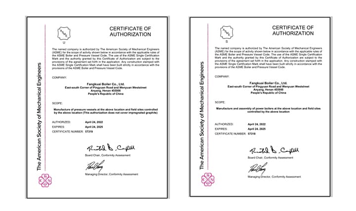 ASME 是“美国机械工程师协会”的简称,主要致力于机械行业相关标准的制订,是具有很高权威性和影响力的国际性学术组织。 ASME 标准也是世界上最早、最具权威性的锅炉及压力容器规范。 ASME 认证是方快锅炉走向国际市场的必由之路,为方快产品进入国际市场提供一份含金量较高的“通行证”。