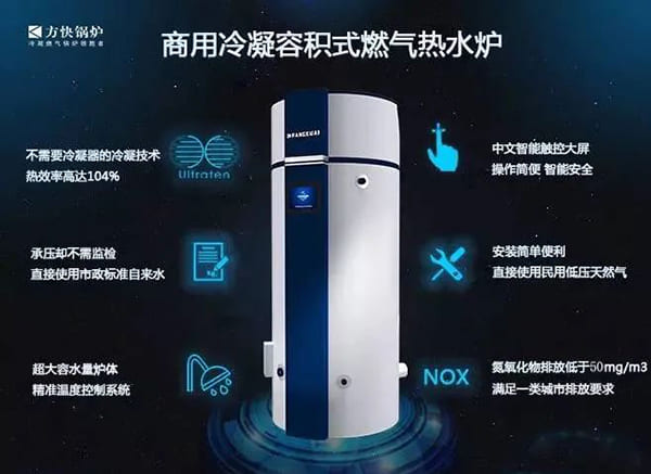 方快V系列冷凝燃气热水炉采用计算机辅助设计,优化了各受热面,使炉体结构更加合理;采用高级离心玻璃棉多层保温,热损失少;选用国标热水炉管,布置合理,换热面积大,热效率高;采用管板自动焊,绝对保证焊缝质量;全新的Ultraten技术换热元件——羽翼管代替光管,充分吸收烟气中的汽化潜热,排烟温度低于50℃,热效率高达104.5%;采用PVC-U材料,永不生锈,耐冷凝水中酸腐蚀,几乎无管道废渣产生,实现了冷凝水排放和残渣收集的分离,其水封结构可避免废气通过冷凝水出口端泄露。