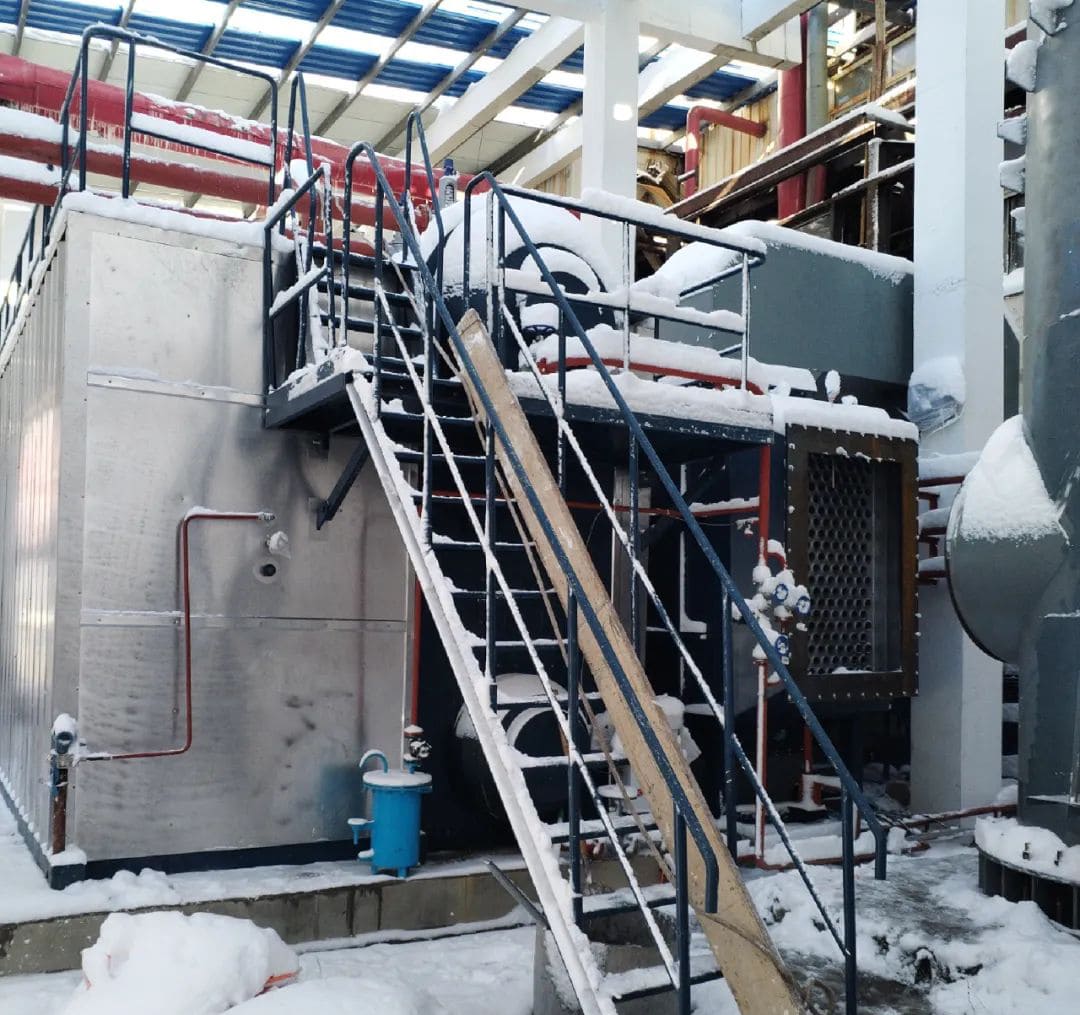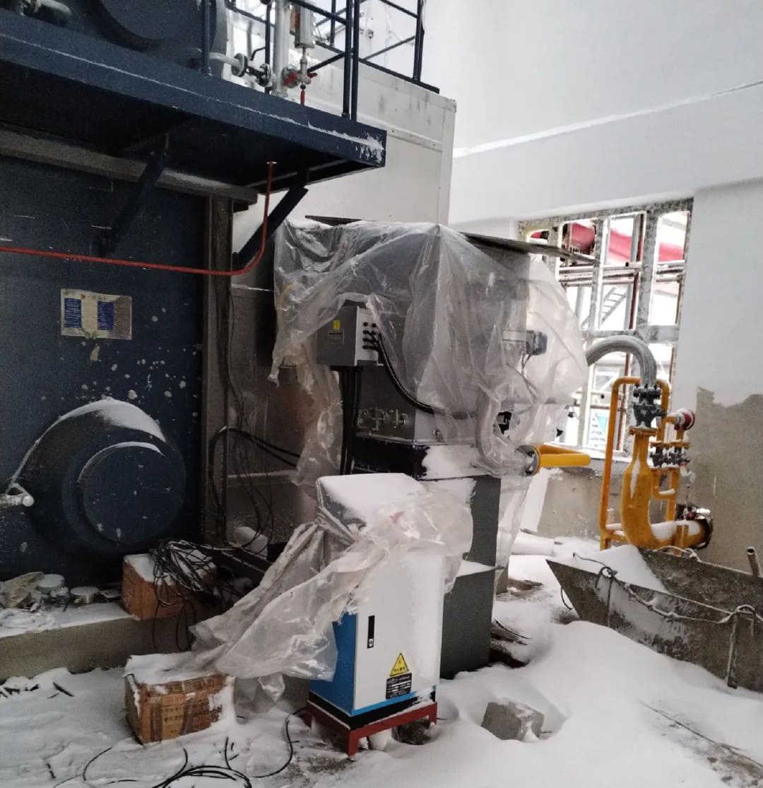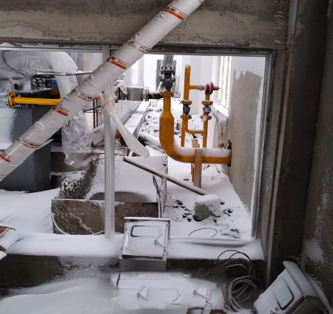 项目地全天持续下雪,由于没有房顶和门窗,各施工环节都受到影响。整个锅炉房已被积雪覆盖并上冻,尹工现场指导安装公司工人放线,并进行控制箱整改。