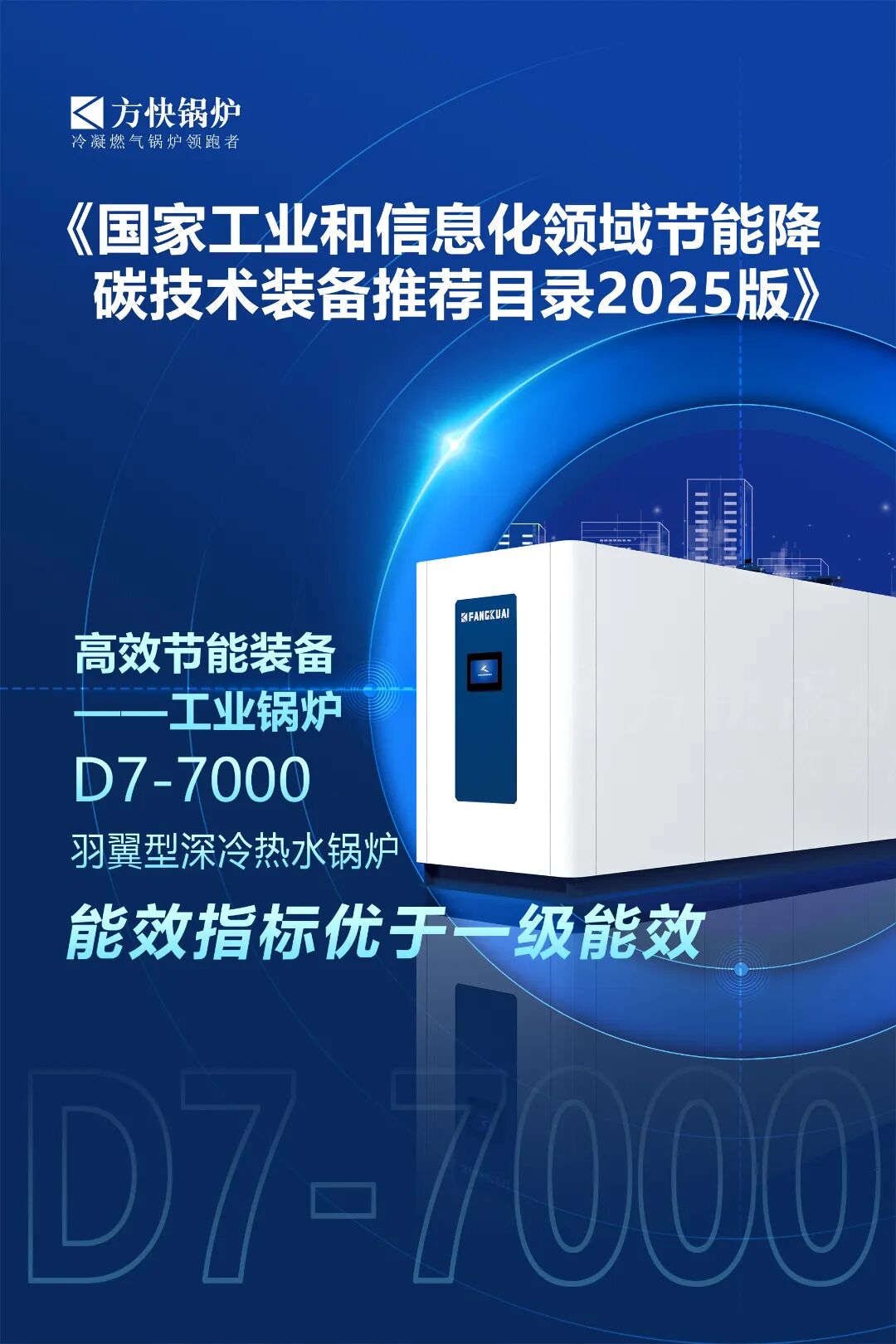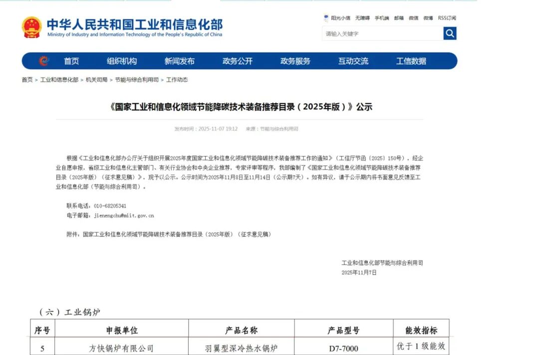 近日,工业和信息化部节能与综合利用司发布《国家工业和信息化领域节能降碳技术装备推荐目录(2025年版)》,方快自主研发的“羽翼型深冷热水锅炉(型号:D7-7000)”,获评“优于1级能效”,此次入选,是国家对方快在节能降碳技术领域持续创新的高度认可。