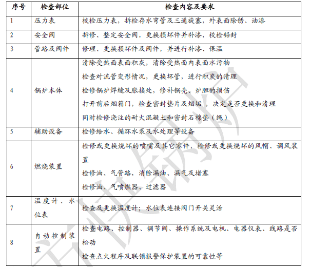 2、锅炉运行每一年后进行一次二级维护,二级维护是指有计划地安排停炉,对设备进行全面的、恢复性的检修或更换零部件的保养工作,以维修人员为主,锅炉运行人员为辅,具体项目见下表: