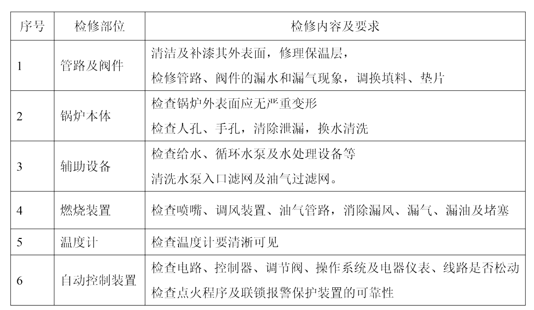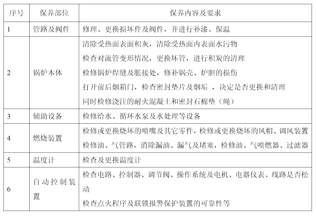 ②锅炉运行每一年后进行一次二级维护保养,二级保养是指有计划地安排停炉,对设备进行全面的、恢复性的检修或更换零部件的保养工作,以维修人员为主,锅炉运行人员为辅,具体项目下表: