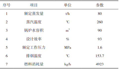 备用炉由启动到达到额定参数仅需1h,一旦2台机组同时停运可减少巨额损失。备用锅炉参数为额定蒸发量80t/h、供热压力1.6MPa,温度260℃。该备用锅炉为自然循环燃油散装锅炉,N型布置、单炉膛、全钢构架,炉膛和通道四周为全膜式水冷壁,通道内布置高、低过热器,中间设面式减温器,通道出口布置对流受热面,尾部设二级省煤器(见表3)。