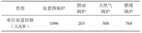 各种备用热源单位容量造价对比见表6。由于电蓄热锅炉具备蓄热的功能,因此造价最高,若去除蓄热模块,单位容量造价约为600元/kW。燃煤锅炉由于涉及到输煤、环保等辅助设施,造价相对较高。其次为燃气锅炉、燃油锅炉。